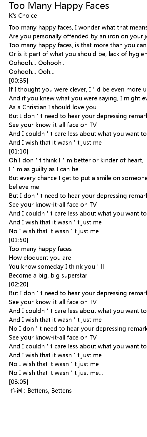 | [00:05] | Too many happy faces, I wonder what that means |
