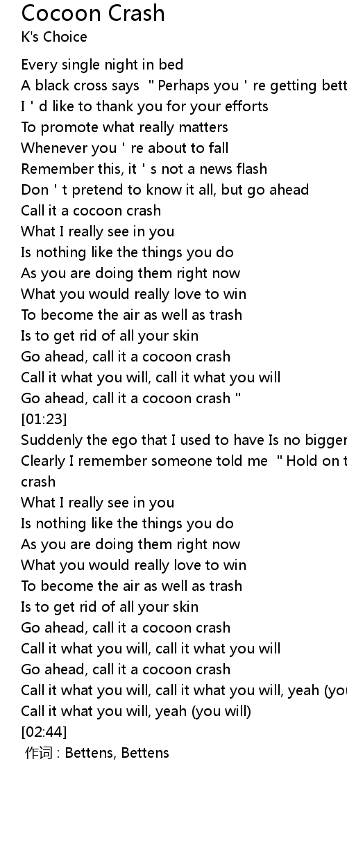 | [01:41] | Clearly I remember someone told me "Hold on tight, here's your cocoon crash |
