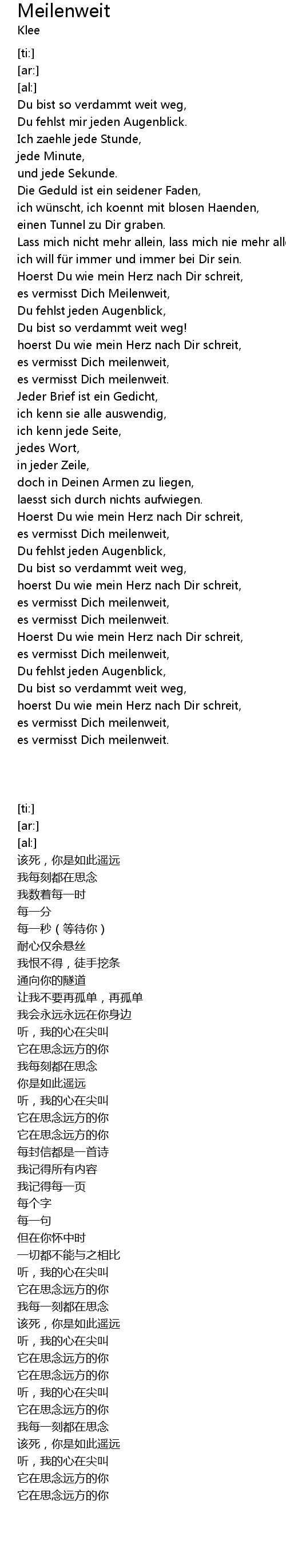 | [02:39.42] | es vermisst Dich meilenweit, |