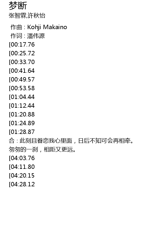 | [04:59.94][04:28.12] | 因心知你一去梦更远 |