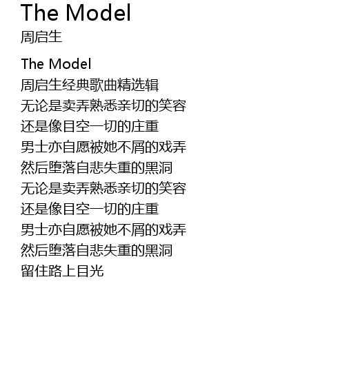 | [00:11.40] | zhōu qǐ shēng jīng diǎn gē qǔ jīng xuǎn jí |