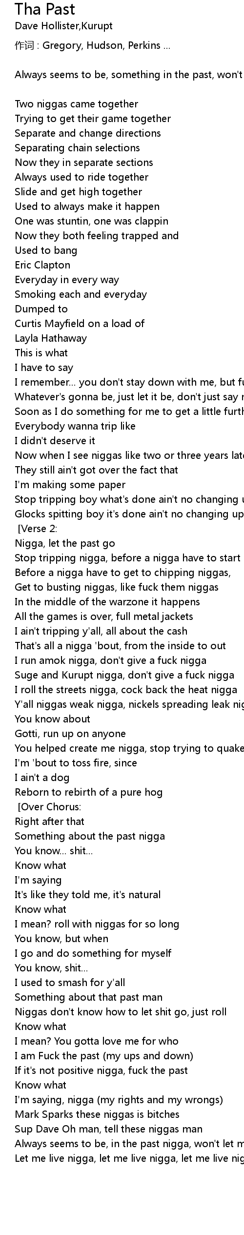 | Fuck the past nigga! [Chorus] [Over Chorus:] | |
