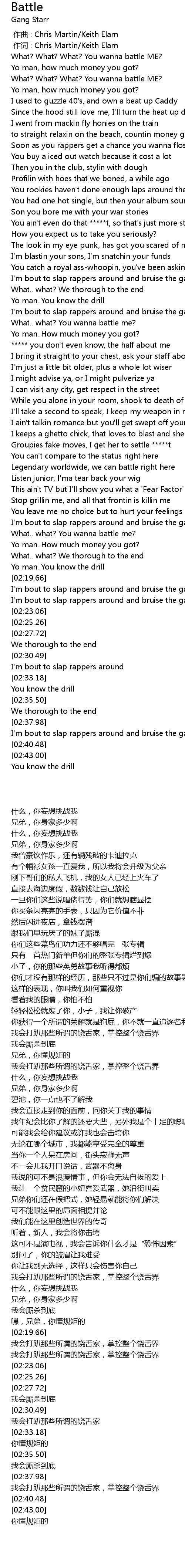 | [00:02.80] | What? What? What? You wanna battle ME? |