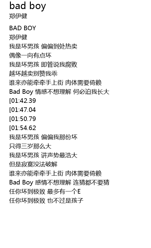 | [02:34.75][01:50.79][00:50.17] | Boy Bad Boy rang shi jian dou he cai |