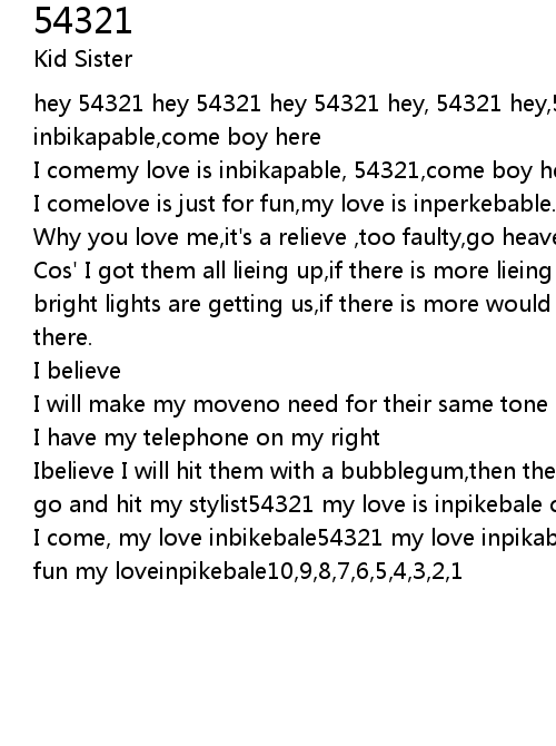 hey 54321 hey 54321 hey 54321 hey, 54321 hey,54321(x2)54321 my love is inbikapable,come boy here |
