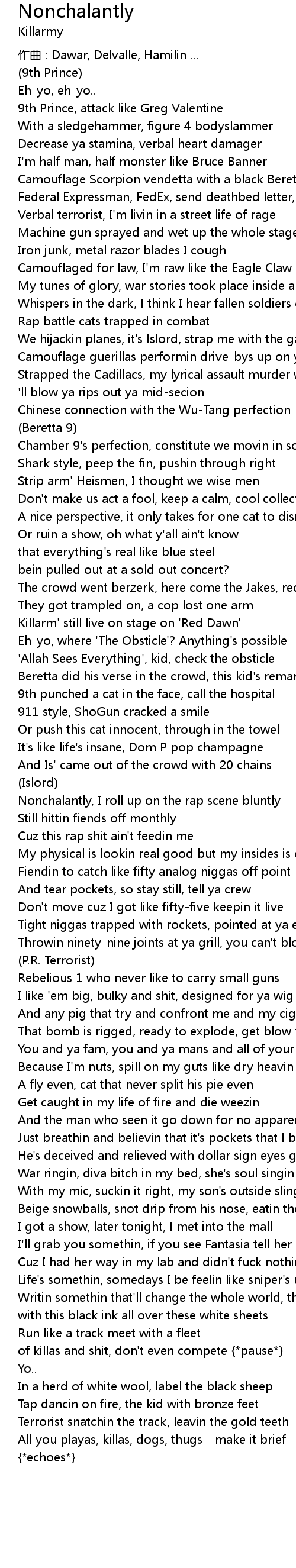 | Nonchalantly, I roll up on the rap scene bluntly | |