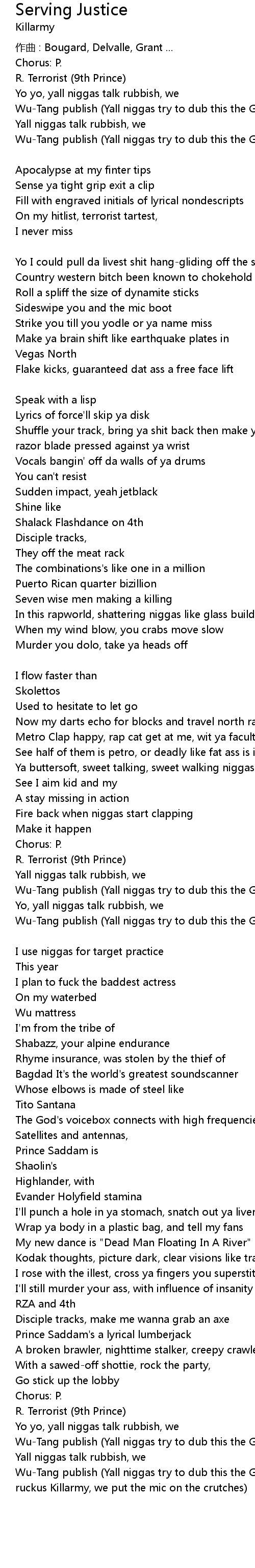 | WuTang publish Yall niggas try to dub this the Gods serving justice, with ruckus Killarmy, we put the mic on the crutches P. R. Terrorist | |