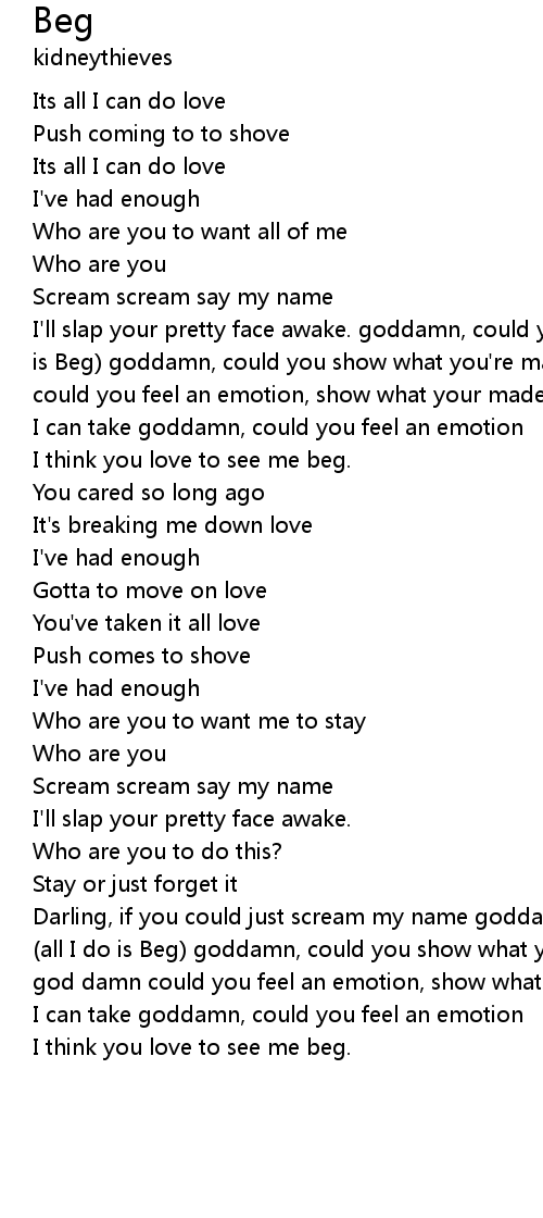 Darling, if you could just scream my name goddamn, could you feel an emotion (all I do is Beg) goddamn, could you show what you're made of (all I do is Beg) god damn could you feel an emotion, show what your made of it's all |