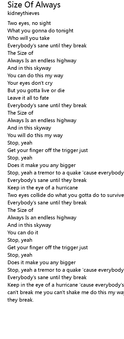 | Keep in the eye of a hurricane ' cause everybody' s sane until they break you can' t break me you can' t shake me do this my way ' cause everybody' s sane until they break. |