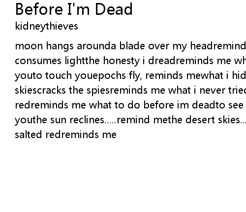| moon hangs arounda blade over my headreminds mewhat to do before im deadnight consumes lightthe honesty i dreadreminds me what to do before im deadto see youto touch youepochs fly, reminds mewhat i hide, reminds methe desert skiescracks the spiesreminds me what i never triedthe ocean wide salted redreminds me what to do before im deadto see youto touch youto feel youto tell youthe sun reclines.....remind methe desert skies....remind methe ocean wide salted redreminds me |