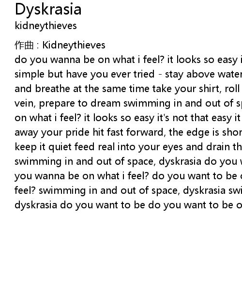 | do you wanna be on what i feel? it looks so easy it' s not that easy it should be simple but have you ever tried stay above water, get in the water, drink it and breathe at the same time take your shirt, roll up your sleeve, tap on your vein, prepare to dream swimming in and out of space, dyskrasia do you wanna be on what i feel? it looks so easy it' s not that easy it should be simple but put away your pride hit fast forward, the edge is shorter, scream and make sure you keep it quiet feed real into your eyes and drain the way that makes you cry swimming in and out of space, dyskrasia do you want to be do you want to be do you wanna be on what i feel? do you want to be one do you wanna be on what i feel? swimming in and out of space, dyskrasia swimming in and out of space, dyskrasia do you want to be do you want to be on what i feel? |