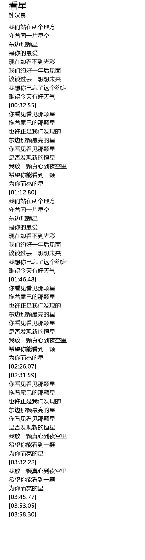 | [00:34.72] | nǐ kàn jiàn kàn jiàn nà kē xīng |