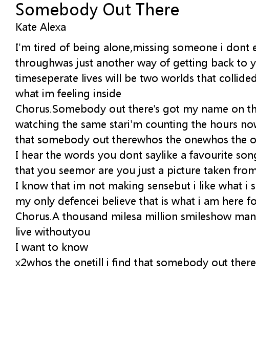 Chorus.Somebody out there's got my name on their heartsomebody out there is watching the same stari'm counting the hours now and it wont be longtill i find that somebody out therewhos the onewhos the one |