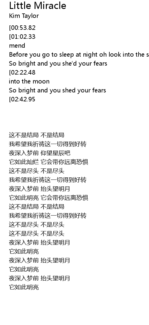 | [01:11.32][02:22.48][02:35.94][02:49.14] | Before you go to sleep at night oh look into the moon |