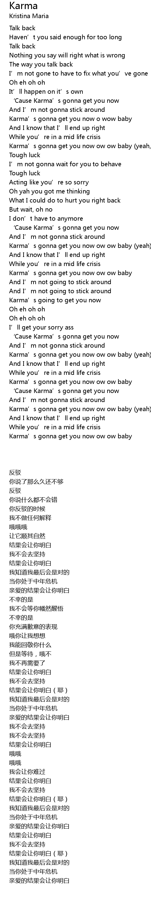| [00:32.15] | ' Cause Karma' s gonna get you now |