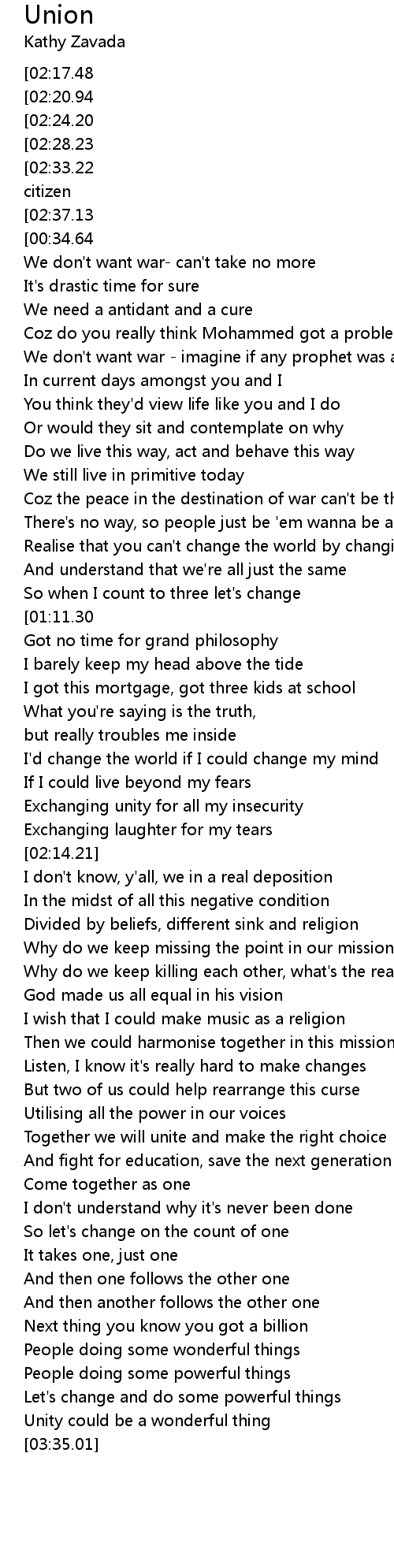 [03:53.95][02:24.20][01:21.42][00:18.64] Let's start a union, calling every human
