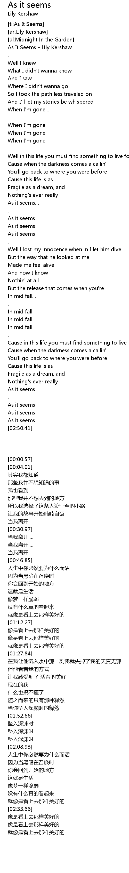 | [00:00.57] | As It Seems - Lily Kershaw |