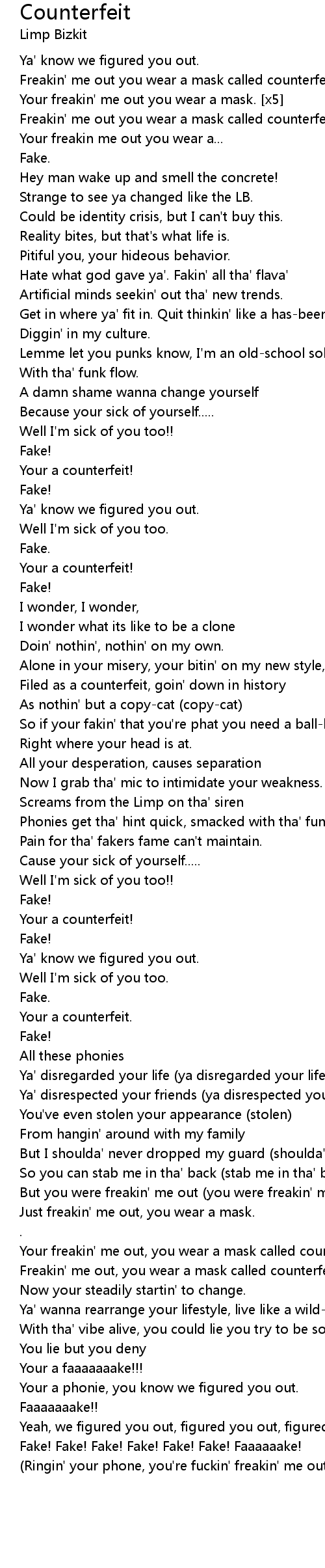 | Freakin' me out you wear a mask called counterfeit. | |