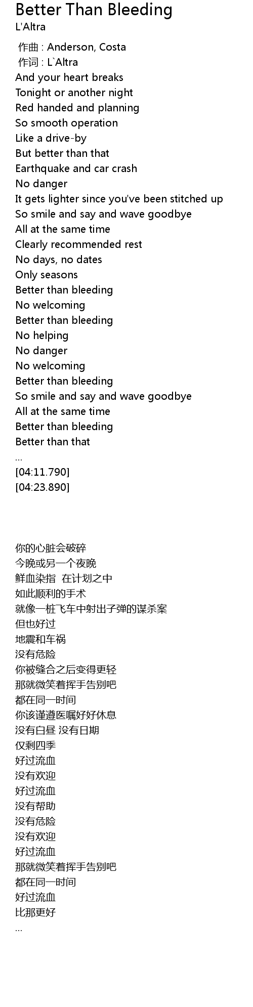 | [01:07.870] | It gets lighter since you' ve been stitched up |