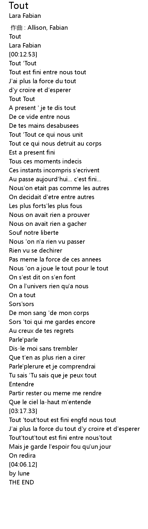 | [03:33.53] | Tout ' tout' tout est fini engfd nous tout |