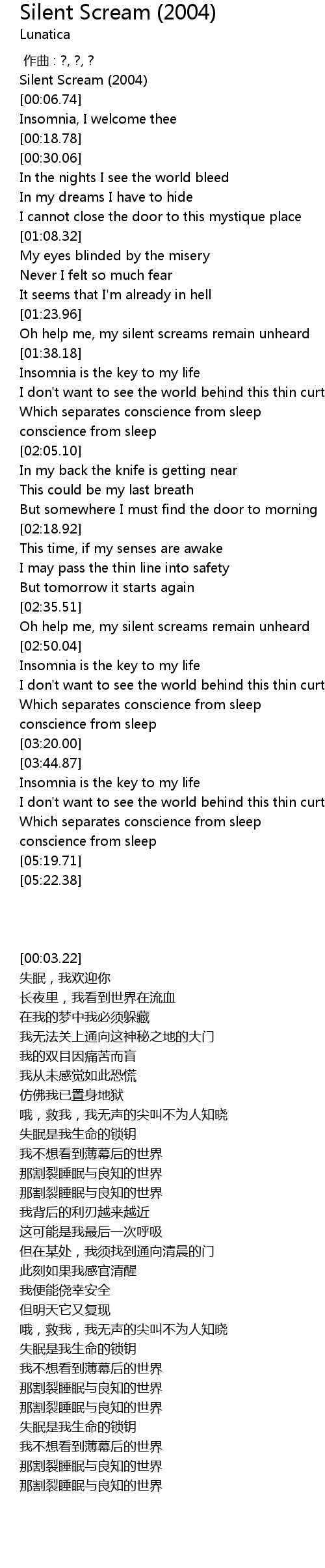 | [02:39.73] | Oh help me, my silent screams remain unheard |