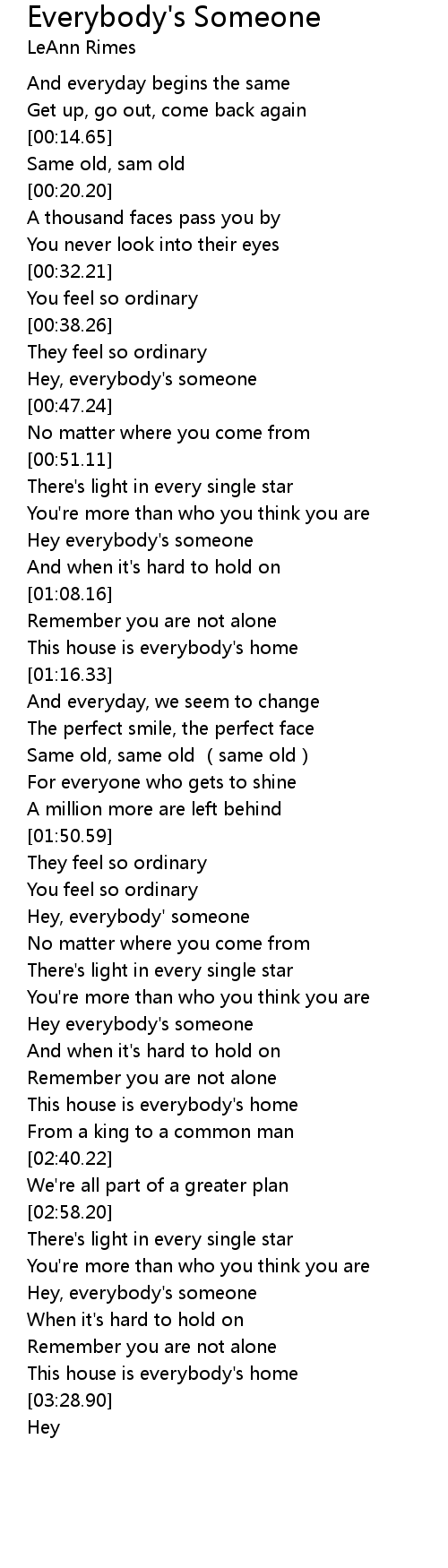 | [03:08.74] | Hey, everybody' s someone |