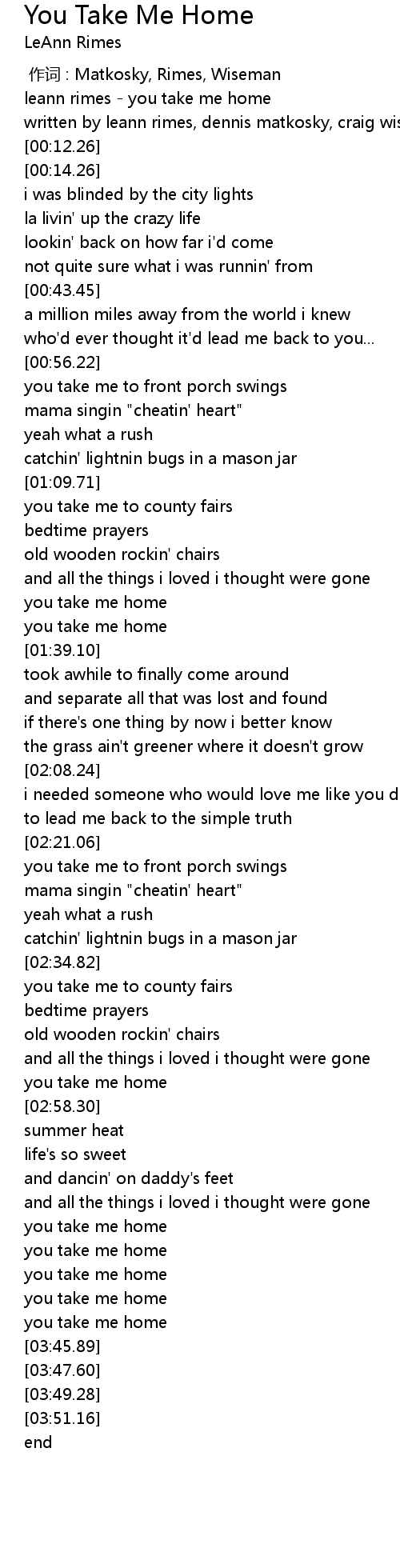| [00:00.00] | leann rimes you take me home |