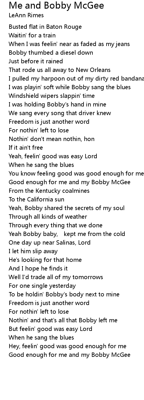 | Good enough for me and my Bobby McGee |