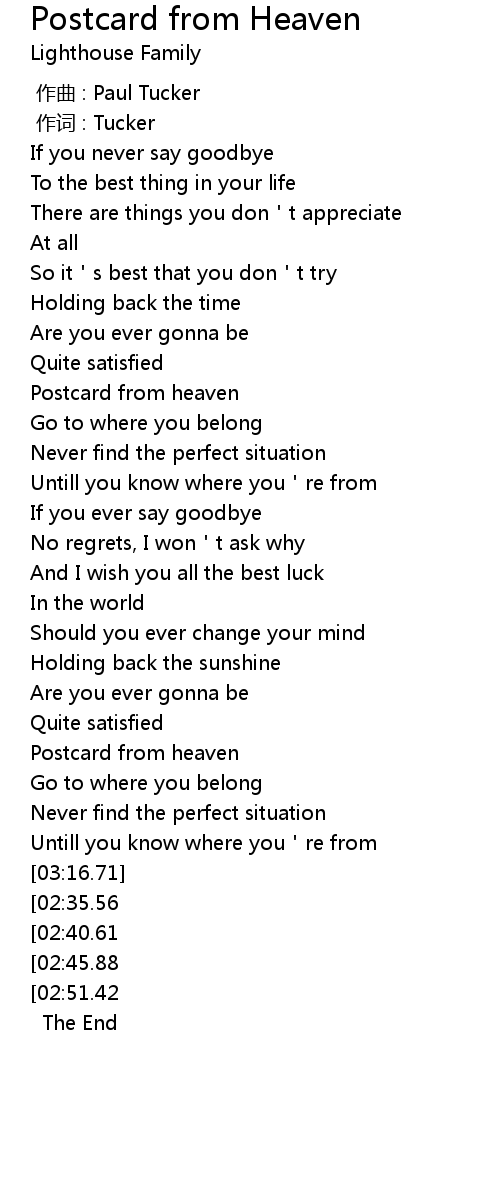 | [00:45.69] | Postcard from heaven |