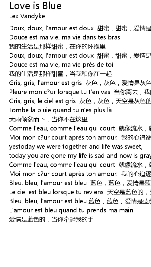 | [02:21.00] | L' amour est bleu quand tu prends ma main ài qíng shì lán sè de, dāng nǐ qiān qǐ wǒ de shǒu |