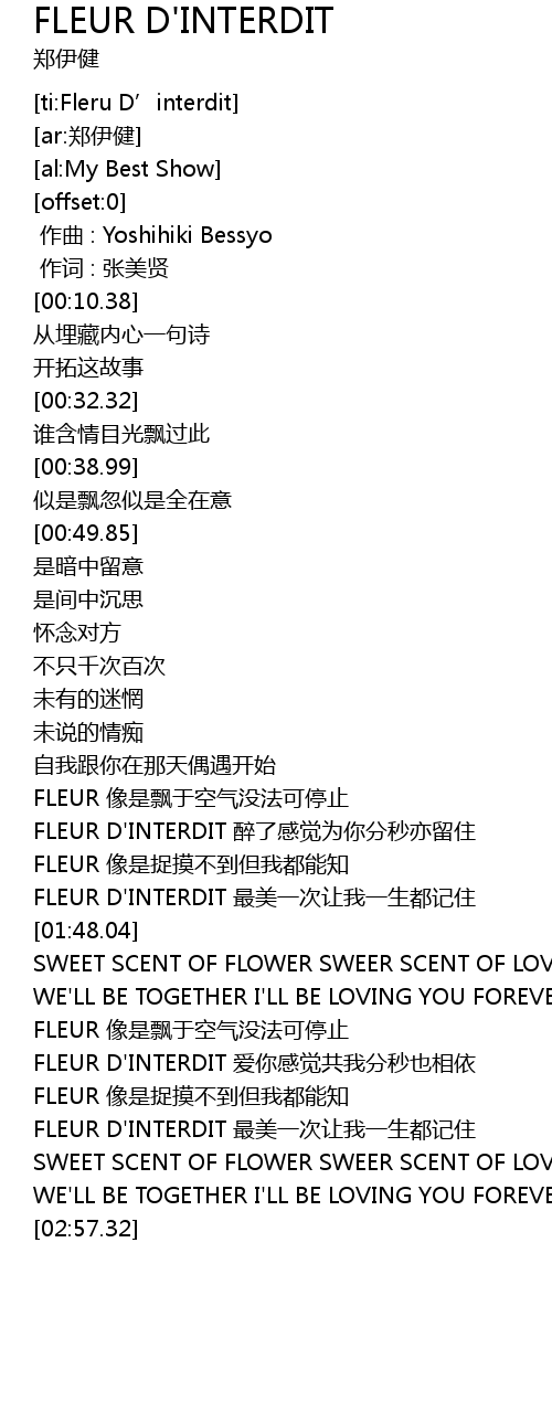 | [02:32.33] | FLEUR D'INTERDIT 最美一次让我一生都记住 |