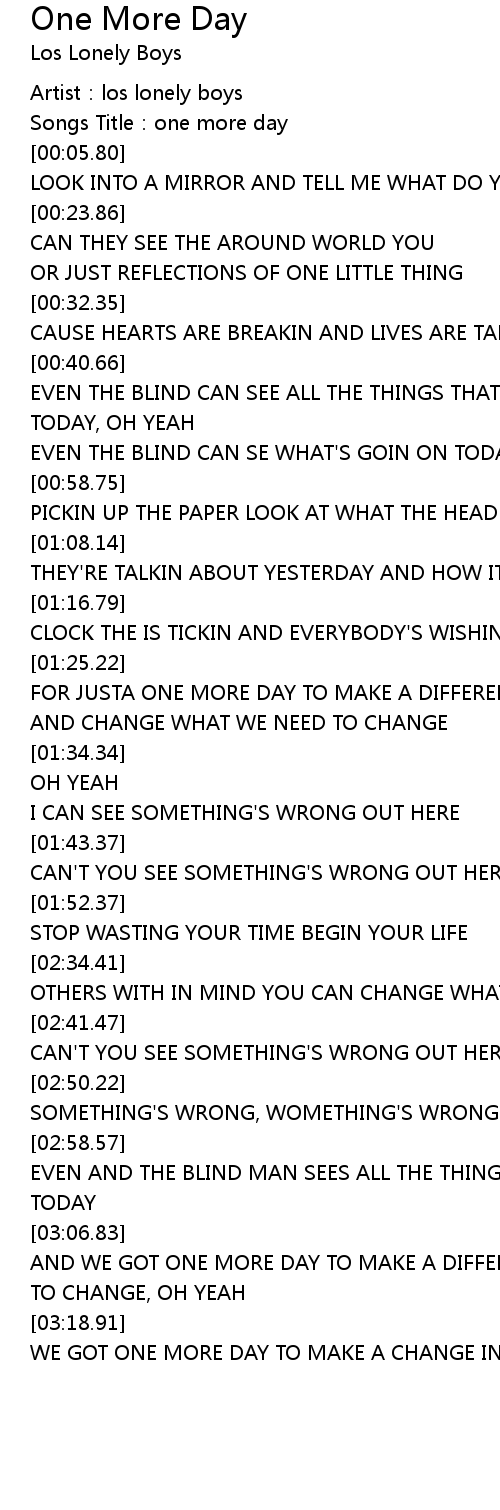 | [03:08.53] | AND WE GOT ONE MORE DAY TO MAKE A DIFFERENCE AND CHANGE WHAT WE NEED TO CHANGE, OH YEAH |