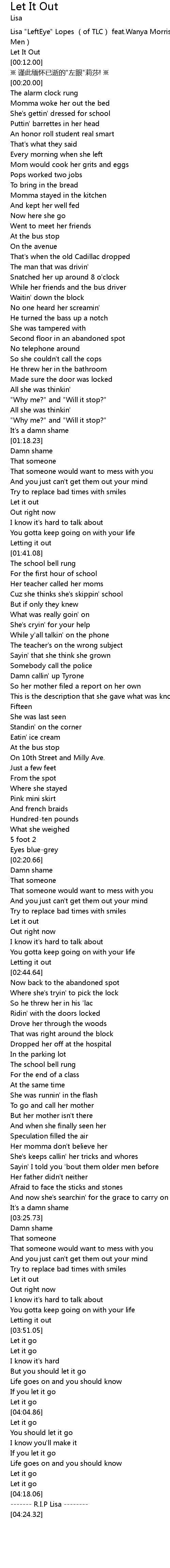 | [04:20.25] | ------- R.I.P Lisa -------- |