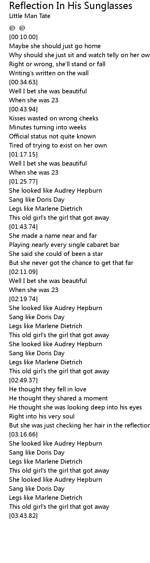 [03:11.57] But she was just checking her hair in the reflection of his sunglasses