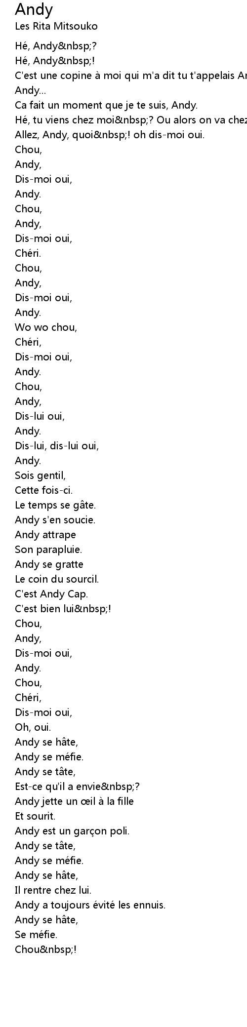 | C' est une copine à moi qui m' a dit tu t' appelais Andy nbsp! | |