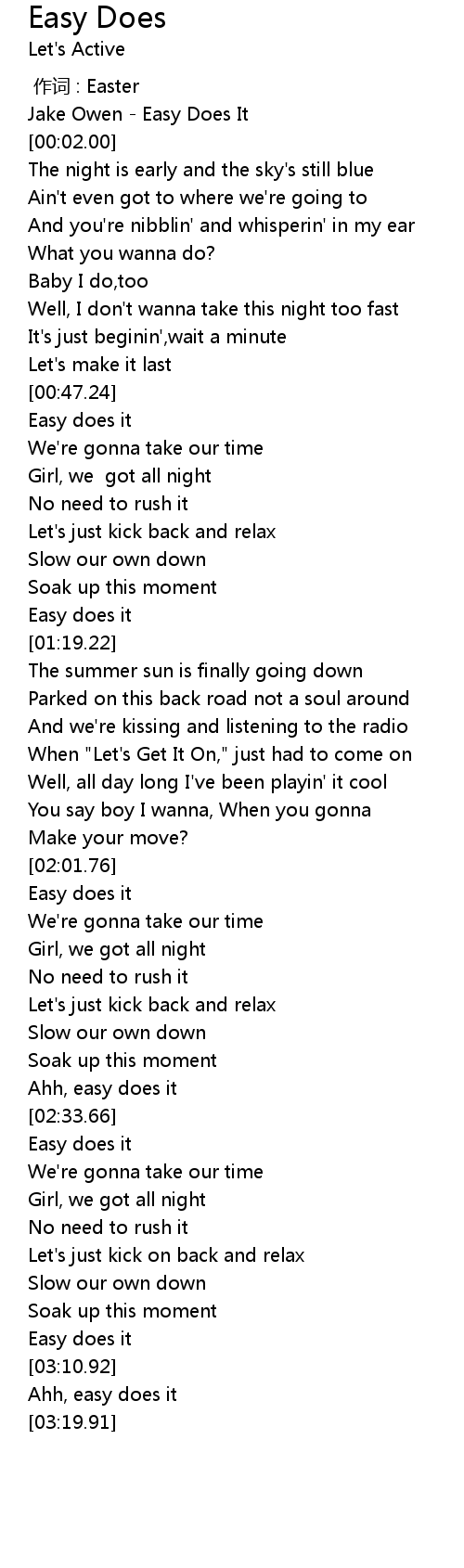 | [00:35.27] | Well, I don' t wanna take this night too fast |