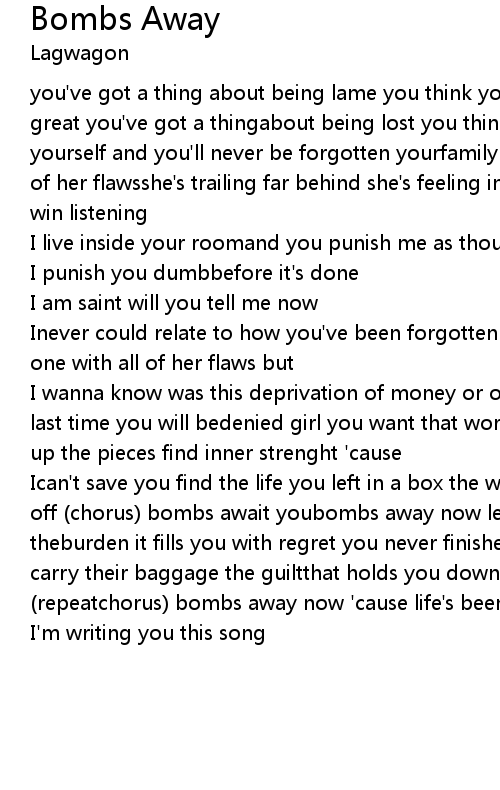 | Ican't save you find the life you left in a box the worldyou said has cut you off (chorus) bombs await youbombs away now let them all fall down you carry theburden it fills you with regret you never finished thatfeeling incomplete you carry their baggage the guiltthat holds you down (repeat pre-chorus) (repeatchorus) bombs away now 'cause life's been so hardand so long that's why | |