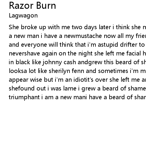 | She broke up with me two days later i think she mether don juan in italy she has a new man i have a newmustache now all my friends are gonna call memountain man and everyone will think that i'm astupid drifter to walk the earth alone i'll nevershave again on the night she left me facial hair grewmiraculously i dressed in black like johnny cash andgrew this beard of shame i've heard it said she looksa lot like sherilyn fenn and sometimes i'm mistakenfor billy gibbons i may appear wise but i'm an idiotit's over she left me and she will soon forget me shefound out i was lame i grew a beard of shame comeall be faithful joyful and triumphant i am a new mani have a beard of shame |