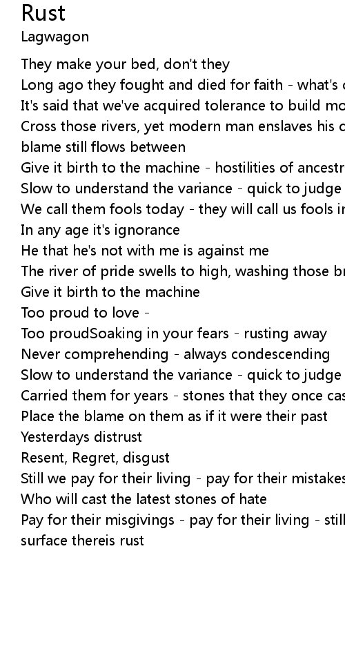 | Pay for their misgivings - pay for their living - still we find thaton the surface thereis rust |