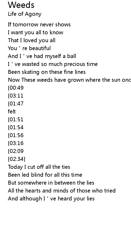 | [03:23][03:11][01:10][02:00] | These weeds have grown where the sun once shown |