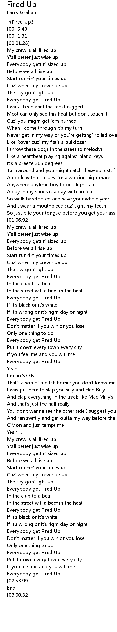 | [02:35.99] | Everybody get Fired Up |