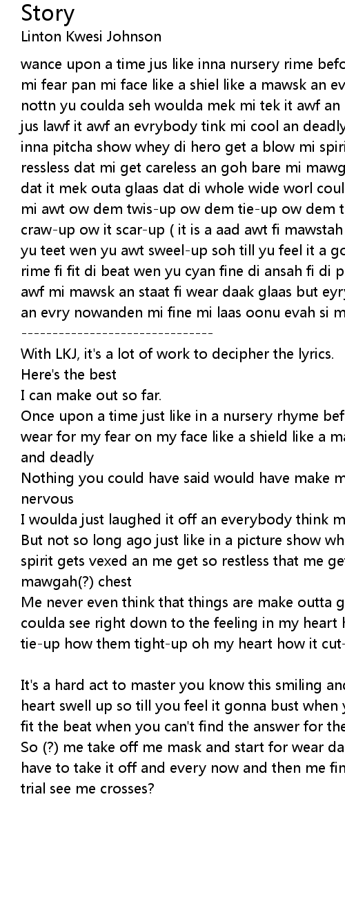 wance upon a time jus like inna nursery rime before piggy tun swine mi did wear mi fear pan mi face like a shiel like a mawsk an evrybody tink mi cool an deadly nottn yu coulda seh woulda mek mi tek it awf an if yu get mi nervos ah voulda jus lawf it awf an evrybody tink mi cool an deadly but not soh long ago ins like inna pitcha show whey di hero get a blow mi spirit get vex an mi get soh ressless dat mi get careless an goh bare mi mawgah chess mi newah indah tink seh dat it mek outa glaas dat di whole wide worl coulda si rite dung to di vien inna mi awt ow dem twis-up ow dem tie-up ow dem tite-up o mi awt ow it cut-up ow it craw-up ow it scar-up ( it is a aad awt fi mawstah yu noe dis smilin an skinin yu teet wen yu awt sweel-up soh till yu feel it a goh bus wen yu cyaan fine di rime fi fit di beat wen yu cyan fine di ansah fi di puzzle complete) soh mi tek awf mi mawsk an staat fi wear daak glaas but eyry so awftin mi haffi tek it awf an evry nowanden mi fine mi laas oonu evah si mi trial si mi crawsiz ? -------------------------------