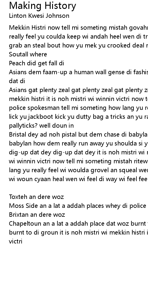 Mekkin Histri now tell mi someting mistah govahment tell mi someting how lang yu really feel yu coulda keep wi andah heel wen di trute done reveal bout how yu grab an steal bout how yu mek yu crooked deal mek yu crooked deal? well doun in |