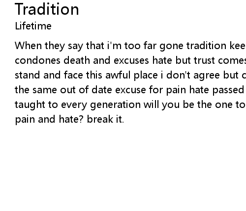 | When they say that i'm too far gone tradition keeps me from moving on it condones death and excuses hate but trust comes natural in it's warm embrace i stand and face this awful place i don't agree but can not escape i will not see the same out of date excuse for pain hate passed down from father to son and taught to every generation will you be the one to break tradition's chain of pain and hate? break it. |
