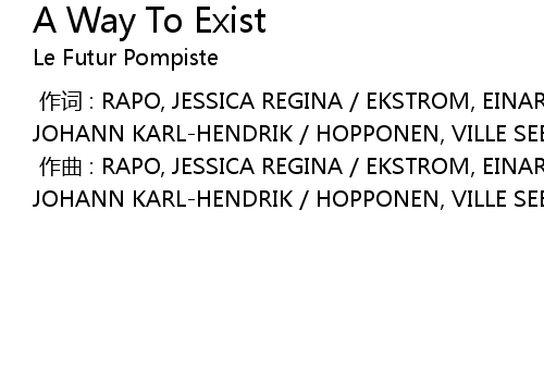 | [00:00.000] | zuò cí : RAPO, JESSICA REGINA EKSTROM, EINAR JOHANNES HOGLUND, JOHANN KARLHENDRIK HOPPONEN, VILLE SEBASTIAN EKSTROM, AXEL VILHELM |