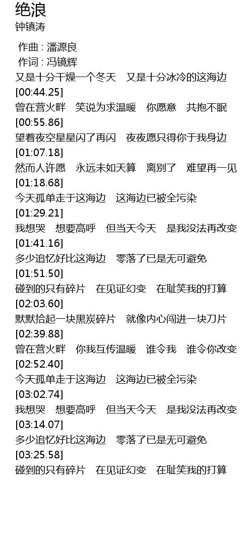 | [00:34.85] | 又是十分干燥一个冬天 又是十分冰冷的这海边 |