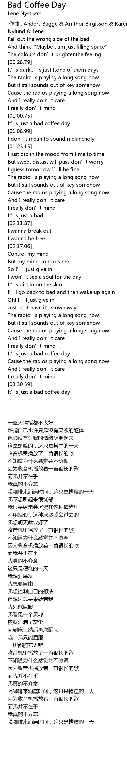 | [03:31.89] | 喝咖啡来消磨时间,这只是糟糕的一天 |