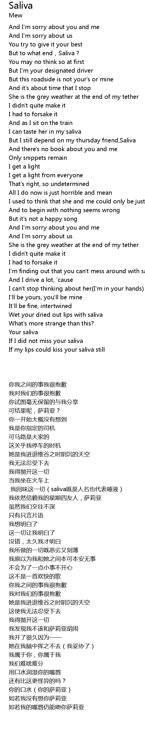 | [01:18.15] | 我回味这一切(saliva既是人名也代表唾液) |