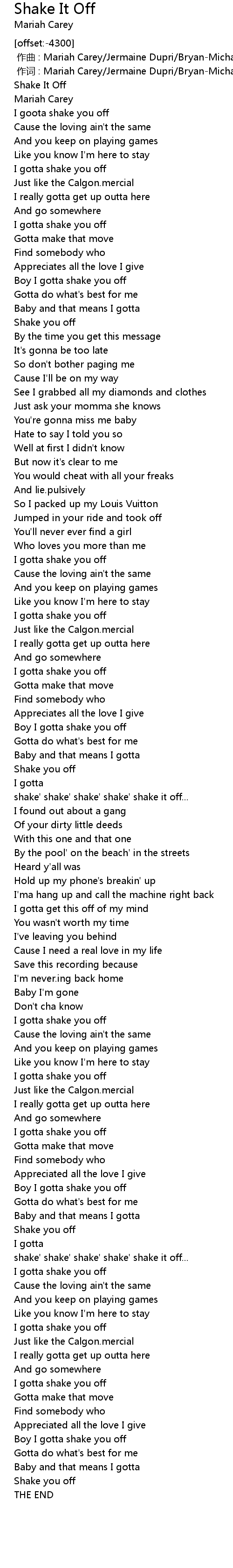 | [02:29.91] | I gotta shake you off |