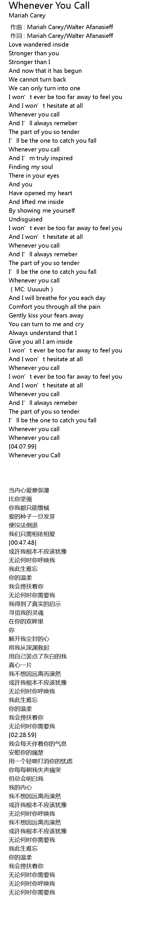 | [00:01.00] | 作词 : Mariah Carey/Walter Afanasieff |